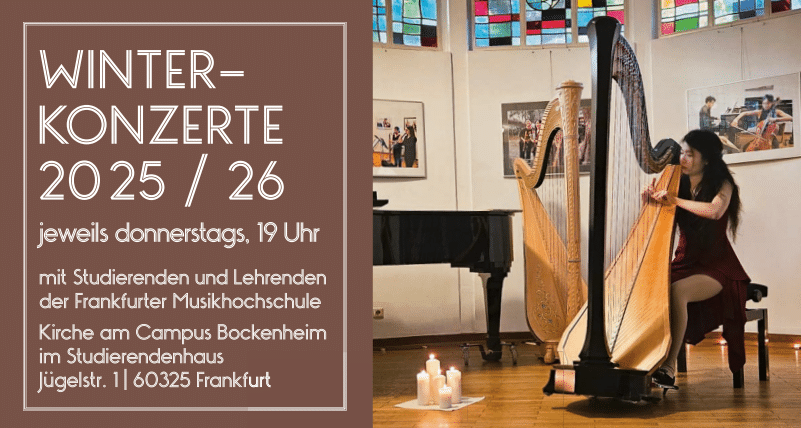 In der Kirche am Campus Bockenheim, Jügelstr. 1, 60325 Frankfurt, finden regelmäßig Konzerte auf hohem Niveau statt. Der Eintritt ist frei, Spenden sind willkommen. Gestaltet werden die stimmungsvollen Abendkonzerte von Studierenden und ehemaligen Studierenden der Frankfurter Musikhochschule, die mit abwechslungsreichen Programmen besondere musikalische Akzente setzen.